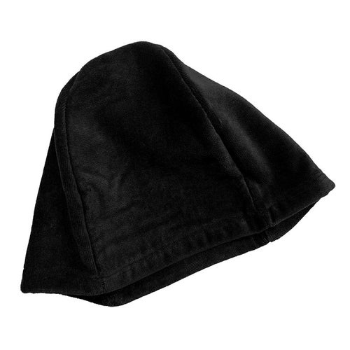 表面シャーリング加工(タオルのくるくるしたパイルをカットする加工)がビロードのような艶感、光沢感、生地色とのコントラストを生み出し、とてもカッコいい仕上がりのサウナハットです。